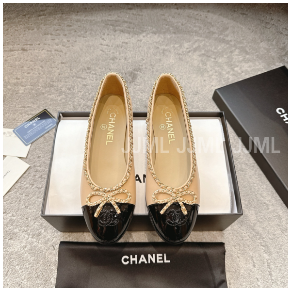 샤넬 투톤 리본 발레리나 플랫 슈즈 베이지
