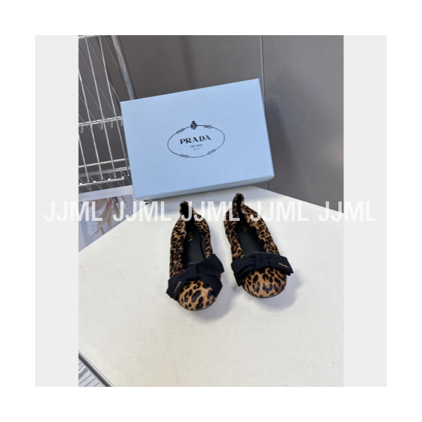 프라다 가죽 스크런치 리본 플랫 호피 스웨이드