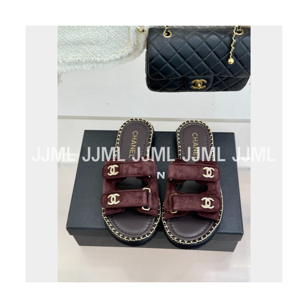 샤넬 벨크로 슬라이드 샌들 스웨이드 버건디
