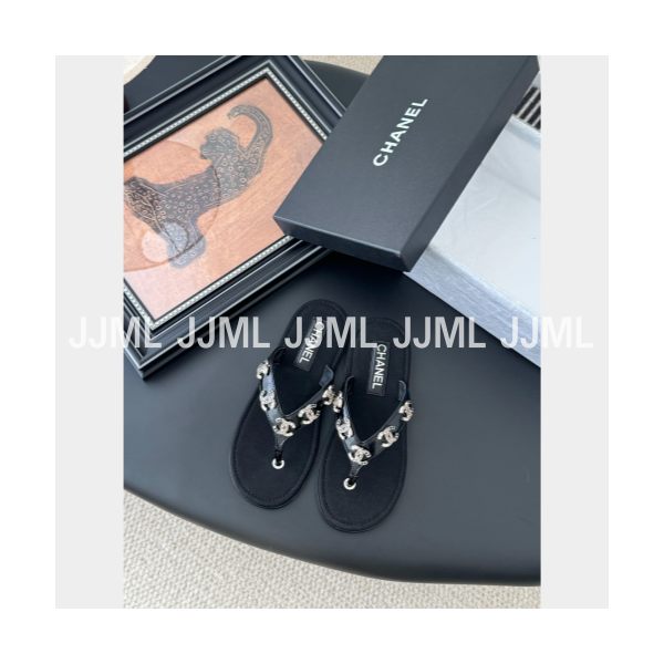 샤넬 로고 참 패턴 플립플랍 슬리퍼 블랙