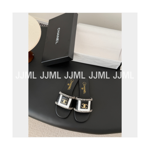 샤넬 라탄 로고 슬리퍼 블랙