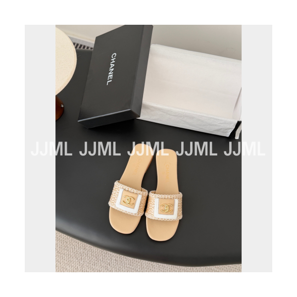 샤넬 라탄 로고 슬리퍼 베이지